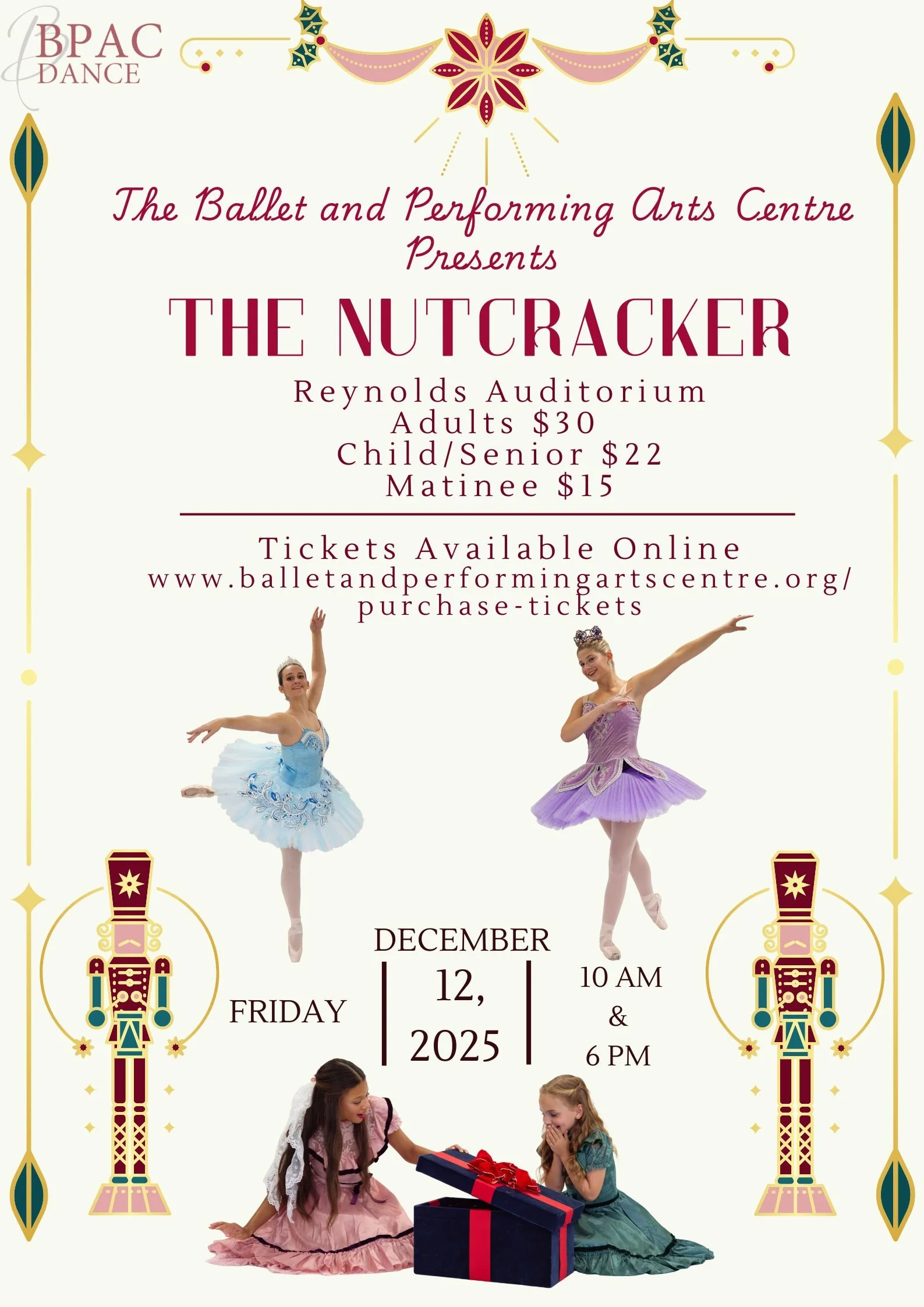 Ring in the magic of the holiday season with The Ballet & Performing Arts Centre’s enchanting production of The Nutcracker! Whether it’s your family’s favorite tradition or a first-time experience, this beloved classic is sure to delight audiences of all ages. Follow Clara, the Nutcracker Prince, and a cast of sparkling characters through a world of snowflakes, sweets, and holiday wonder — performed by talented young dancers from BPAC.